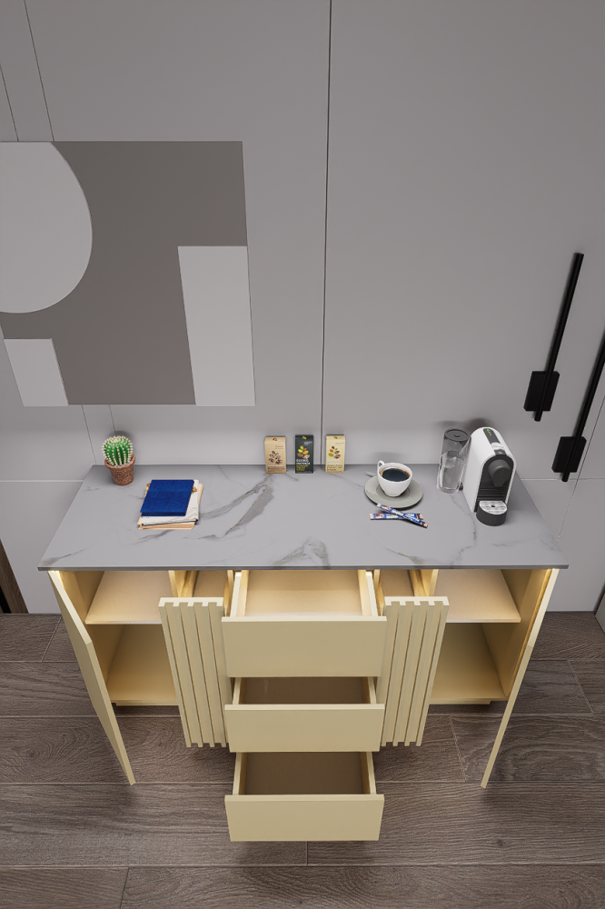 - تمتاز الأدراج المغلقة الطولية بأحجامها المتنوعة؛ لتمنحك سهولة في تنظيم مستلزمات القهوة والأواني.