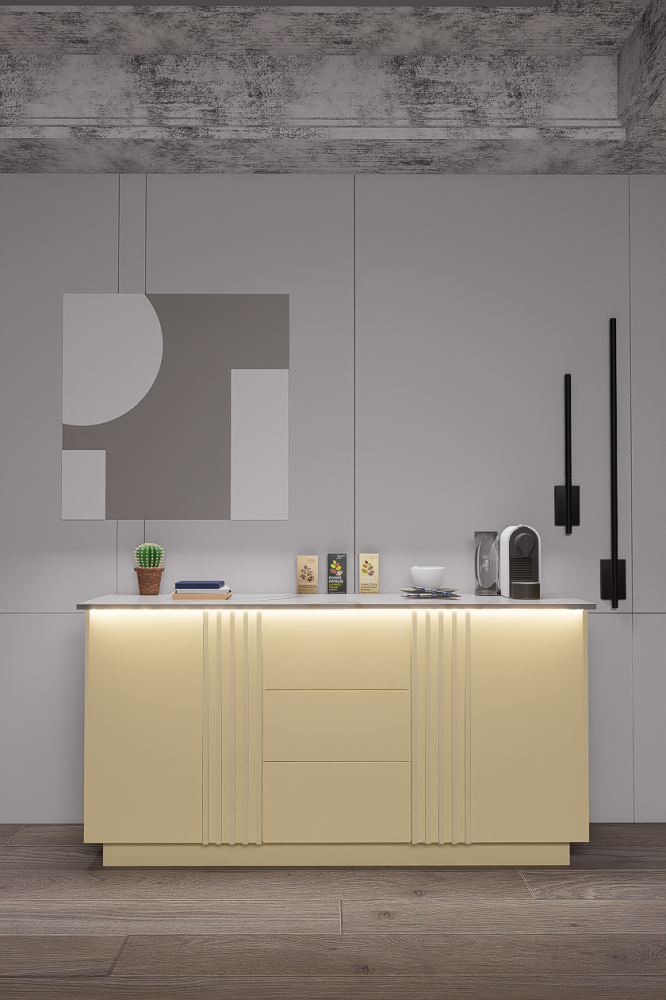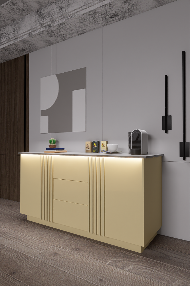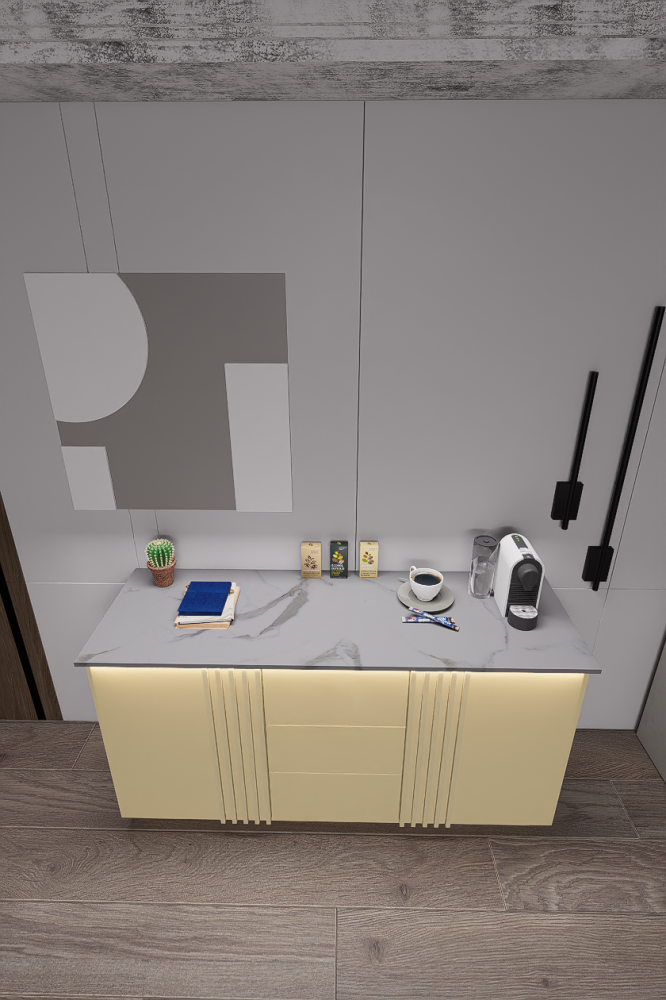 - توفر الإضاءة العلوية والسفلية توزيعًا متساويًا للضوء وتبرز تفاصيل ركن قهوة بيج جاهز وتدعم أجواء الاسترخاء أثناء تحضير القهوة.