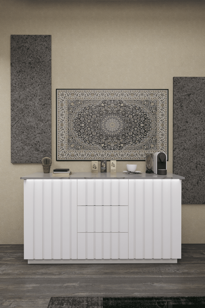 مع بار قهوة منزلي بنقشات دائرية عصرية وإضاءة مخفية من عالم الكوفي، ستحصل على تصميم عصري يتناغم مع كل زاوية. مع أدراجه المغلقة بأحجام متنوعة ورفوف التخزين والزينة، هذا الركن هو الاختيار المثالي للمساحات التي تحتاج إلى لمسة مبتكرة ومميزة. اختر التميز، ودع هذا الركن يكون جزءًا من منزلك.